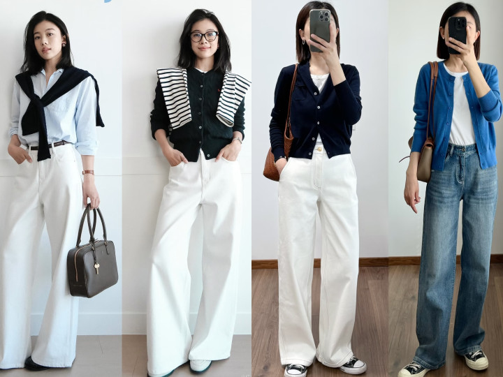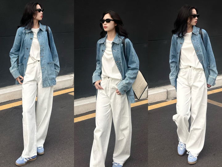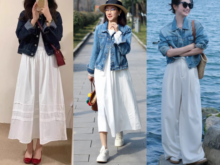 公式⑥:牛仔外衣+白色连衣裙/阔腿裤