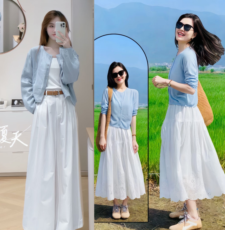 公式②:雾霾蓝真诚衫+白色半身裙/阔腿裤