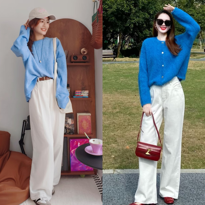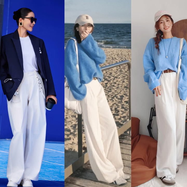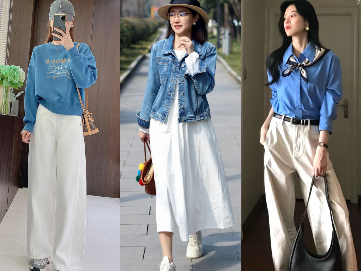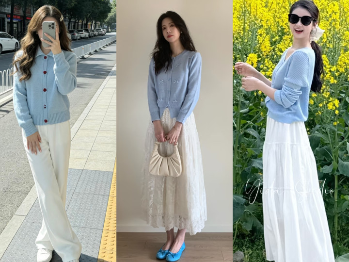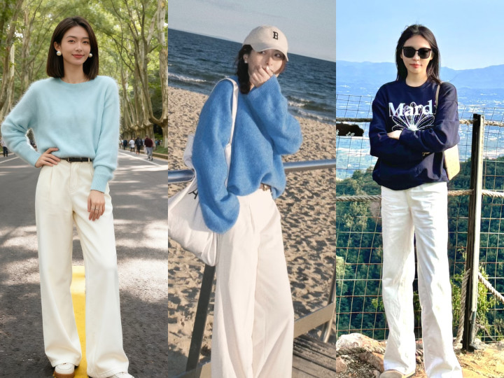 在聘请蓝色和白色服装搭配时,全体色磨灭谐,更洋气。比如浅蓝搭配冷白,浅蓝色蓝里透着白调,冷白色则略偏蓝调,二者调性匹配,气质清凉高等又洋气。