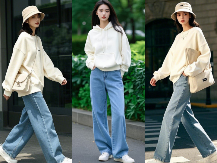 白色卫衣是春天的硬核单品,显白又有活力,下装搭配牛仔直筒裤,加强造型自在感。小白鞋和渔人帽与造型酿成立场呼应,慵懒好意思丽又随心。