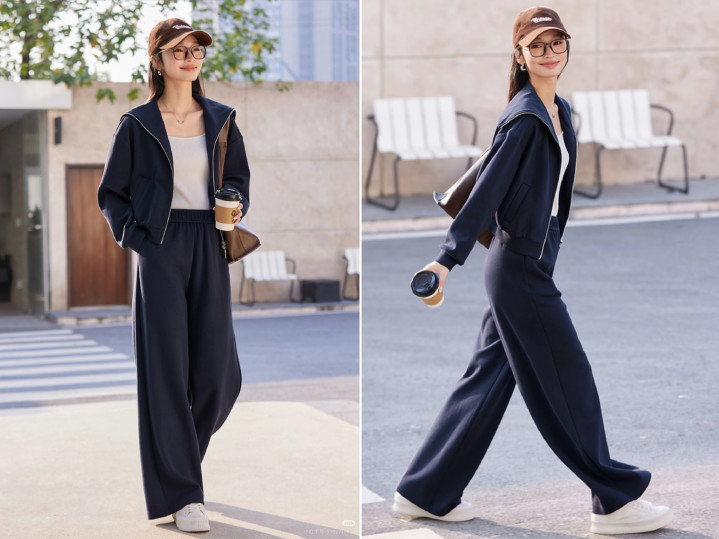 藏蓝色怒放套装,十分恰当中年女性春天衣服,浅近便捷。只须聘请一件白色背心或吊带穿在内部就不错。大开拉链让白色内搭和鞋子酿成荆棘呼应,外出戴上一顶棒球帽,显瘦显年青。