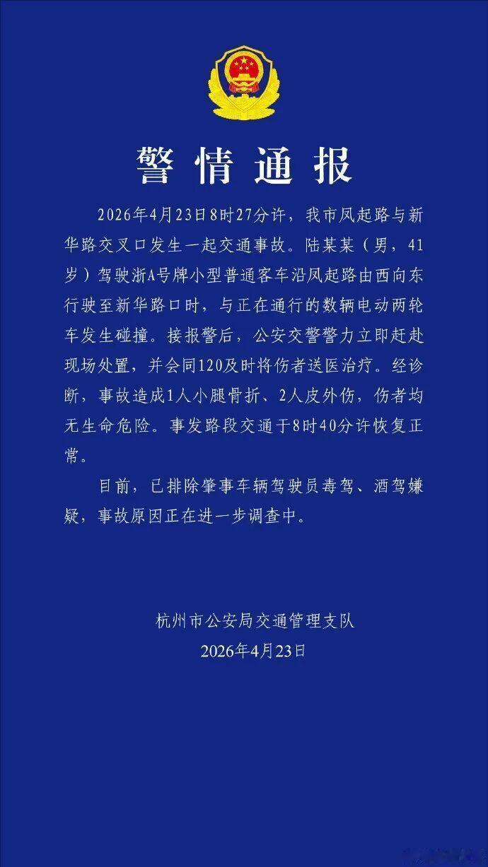 2026年4月23日8时27分许,杭州市凤起路与新华路交叉口发生一皆交通事故。陆某某(男,41岁)驾驶微型平凡客车沿凤起路由西向东行驶至新华路口时,与正在通行的数辆电动两轮车发生碰撞。接报警后,公安交警警力立即前往现场贬责,澳门新浦京游戏下载并会同120实时将伤者送医调治。经会诊,事故酿成1东谈主小腿骨折、2东谈主皮外伤,伤者均无生命危急。事发路段交通于8时40分许复原平方。现在,已摈斥闯祸车辆驾驶员毒驾、酒驾嫌疑,事故原因正在进一步访谒中。