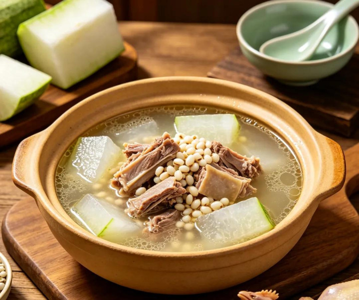鸭肉性凉滋阴,搭配冬瓜清热利水、薏米健脾祛湿,汤品清淡不浓重,喝上一碗,能有用排出体内潮湿,缓解体魄困倦。