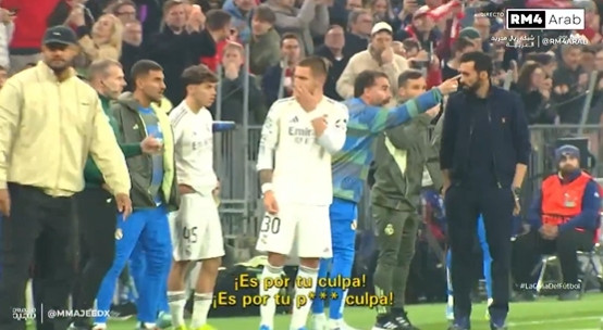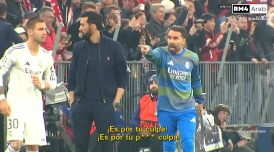 DAZN字据Movistar+的镜头捕捉到,卡瓦哈尔其时手指裁判怒喷:“这是你的错,这他X的全是你的错!”