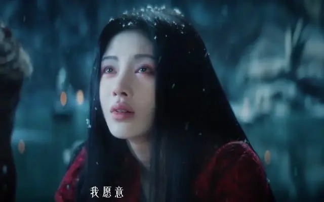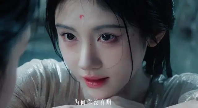她身着绣银线白纱裙,身姿挺拔、风范绝佳,眉眼间既有小狐妖的生动灵动,又藏着复仇的阴凉疏离,俯首垂眸都透着易碎又强项的劲儿。